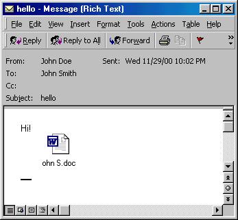 Next the worm goes through Outlook's Sent Items folder. If there is more than two messages, the worm will take the recipient name of the first message. If the name is shorter than five characters, the name will be taken as it is, otherwise the worm will take five characters from the name starting from the second one. The resulting string will be used as an attachment name.
