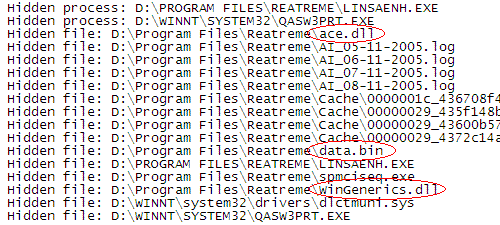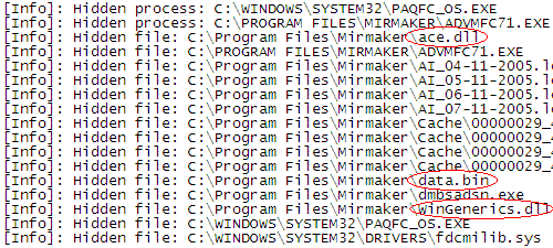 Apropos contains a kernel-mode rootkit that allows it to hide files, directories, registry keys, and processes. The rootkit is implemented by a kernel-mode driver which starts automatically early in the boot process. When the files and registry keys have been hidden, no user-mode process is allowed to access them.