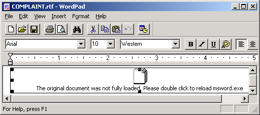 The spammed emails appear to come from the U.S. Internal Revenue Service (IRS). The attachment contains a file named "COMPLAINT.rtf".When this RTF file is opened, it will display a fraudulent message that the original document was not loaded and will prompt the user to double click on the embedded object to reload msword.exe. Below is the sample message: