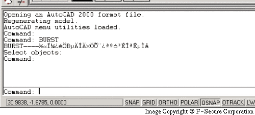 Bursted is a virus written for AutoCAD's embedded scripting language, AutoLISP. It replicates in a separate file, "acad.lsp" that is automatically executed by AutoCAD. It does not affect the actual drawing files.