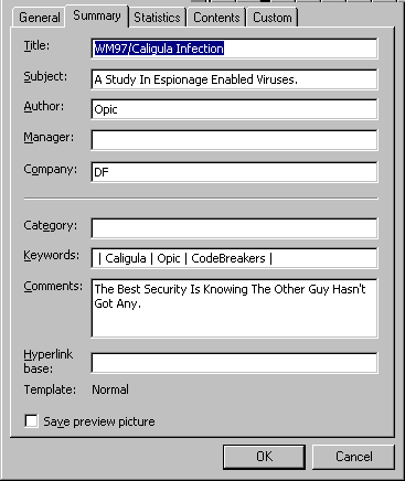Title: WM97/Caligula Infection Subject: A Study In Espionage Enabled Viruses Author: Opic Keywords: / Caligula / Opic / Codebreakers / Comments: The Best Security Is Knowing The Other Guy Hasn't Got Any