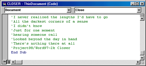 'I never realized the lengths I'd have to go 'All the darkest corners of a sense 'I didn't know 'Just for one moment 'hearing someone call 'Looked beyond the day in hand 'There's nothing there at all 'Project98/Word97-2k Closer
