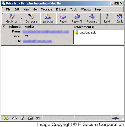 Using its own SMTP engine Bagle sends messages with infected attachments to the collected addresses. The SMTP engine uses direct Mail eXchange (MX) lookup on the target domain so it does not depend on email settings of the infected computer. The body of the messages is empty. The sender address in the email is spoofed. The infected emails can have the following subjects: