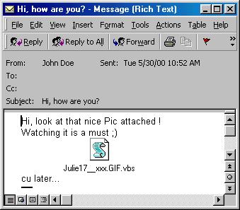 Then the script creates one email which is emailed (as a BCC) to each contact in the user's Outlook address book. The email will contain the worm, which is attached with the filename previously chosen.
