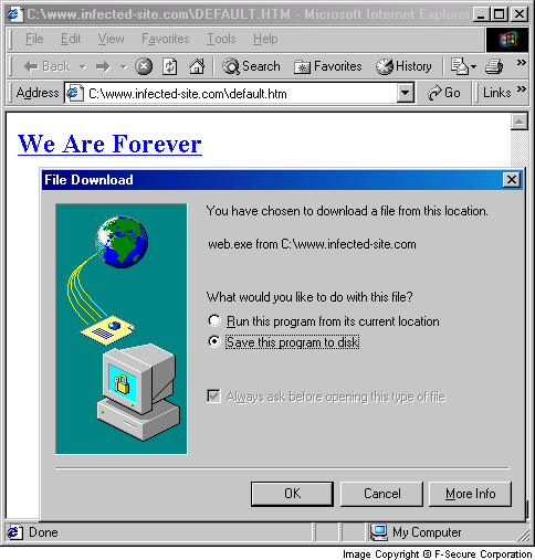 The worm can also spread from a webpage. It checks if the infected machine has Microsoft IIS web server installed. It it is found the worm copies itself as WEB.EXE to root IIS folder, renames DEFAULT.HTM to REDESI.HTM (note: Redesi is the name of another virus) and creates its own DEFAULT.HTM page. If a visitor of a website opens this page, he will be asked to download WEB.EXE file. If a user accepts to 'Run this file from current location', the worm will be downloaded and activated on his system.