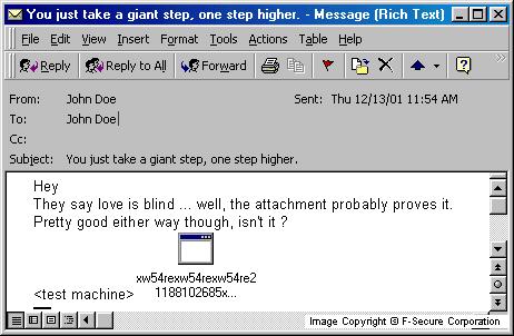 The attachment name is randomly composed from a few parts that are hardcoded in the worm's body. The attachment can have .PIF, .SCR, .EXE, .BAT and .COM extension. Example: