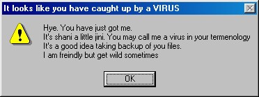 After that the virus starts to show random message boxes at random times. These message boxes contain one of the following texts:
