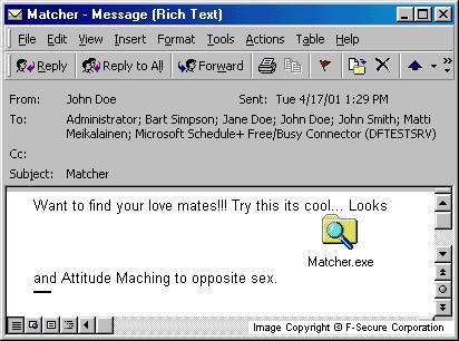 Matcher is an email worm written in Visual Basic. It was first discovered on April 18th, 2001. The worm's file is a PE executable about 29kb long. The worm file is not encrypted or packed. To be run the worm requires MSVBVM60.DLL library to be present in a system.