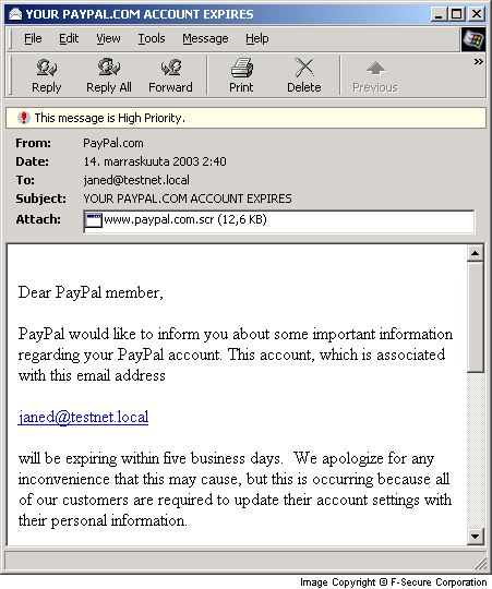 Dear PayPal member, PayPal would like to inform you about some important information regarding your PayPal account. This account, which is associated with this email address recipient@somewhere will be expiring within five business days. We apologize for any inconvenience that this may cause, but this is occurring because all of our customers are required to update their account settings with their personal information. We are taking these actions because we are implementing a new security policy on our website to insure everyone's absolute privacy. To avoid any interruption in PayPal services then you will need to run the application that we have sent with this email (see attachment) and follow the instructions. Please do not send your personal information through email, as it will not be as secure. IMPORTANT! If you do not update your information with our secure application within the next five business days then we will be forced to deactivate your account and you will not be able to use your PayPal account any longer. It is strongly recommended that you take a few minutes out of your busy day and complete this now. DO NOT REPLY TO THIS MESSAGE VIA EMAIL! This mail is sent by an automated message system and the reply will not be received. Thank you for using PayPal.