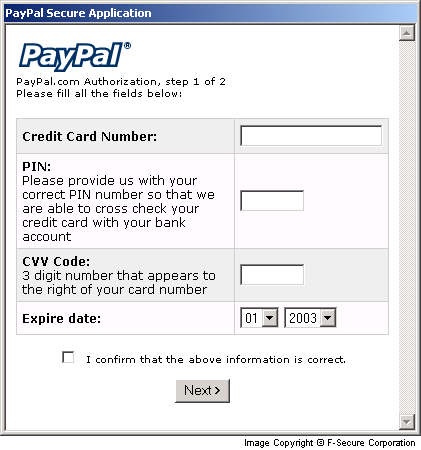 On executing the worm, a fake web form that appears to be from Paypal is displayed. This is a Social Engineering trick used by the worm to deceive users into entering their credit card information into the form.