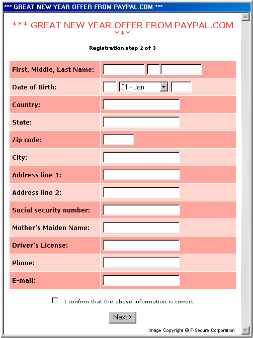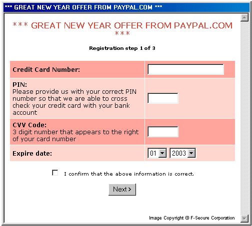 After initial startup the worm asks a userto fill a fake PayPal form. Information from that form is saved to a file and is sent to the worm's author. The form pages look like that: