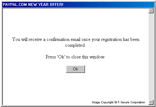 From: donotreply@paypal.com Subject: GREAT NEW YEAR OFFER FROM PAYPAL.COM! [some random characters] Body: Dear PayPal.com Member, We here at PayPal.com are pleased to announce that we have a special New Year offer for you! If you currently have an account with PayPal then you will be eligible to receive a terrific prize from PayPal.com for the New Year. For a limited time only PayPal is offering to add 10% of the total balance in your PayPal account to your account and all you have to do is register yourself within the next five business days with our application (see attachment)! If at this time you do not have a PayPal account of your own you can also register yourself with our secure application and get this great New Year bonus! If you fill out the secure form we have provided PayPal will create an account for you (it's free) and you will receive a confirmation email that your account has been created. That's not all! If you resend this letter (with its attachment) to all of your friends you may be eligible to receive another New Year bonus because the 1000 PayPal members that send the most of these to their friends will get the bonus. If you are one of these 1000 lucky members then PayPal will add 17% of your total balance to your account! Registration is simple. Just unpack the attachment with WinZip, run the application, and follow the instructions we have provided. If you have problems opening the application then you may want to try downloading a free version of WinZip from www.winzip.com Do not miss your chance at this fantastic opportunity! Thousands of our current customers have already received their prizes and now it's your turn; so hurry up and take advantage of this special offer! Best of luck in the New Year, PayPal.com Team Attachment: pp-app.zip