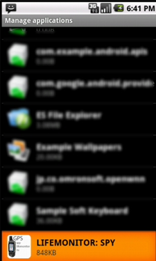 Lifemonspy.A as viewed through the 'Manage applications' window