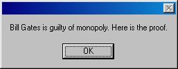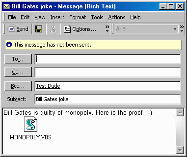 Subject: Bill Gates joke Body: Bill Gates is guilty of monopoly. Here is the proof. :-) Attachment: MONOPOLY.VBS