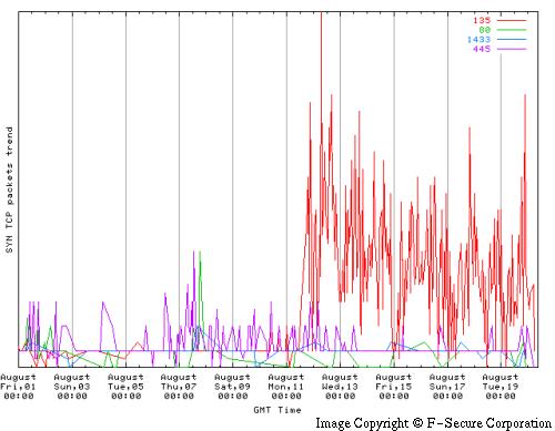 In the following graphic, showing the relative amount of TCP Syn packets that our network sensor system received between 1st and 20th of August, can be appreciated an clear increase in the number of occurrences of packets in the port 135 (In red).