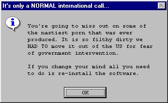 When installing the software, it explains that the software is going to call out with a modem to download pornographics pictures "from another country" as they are "too explicit to be stored in USA".