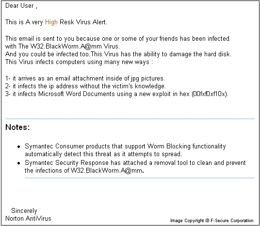 The GIF file is added to the beginning of the constructed email message to make the recipient think it was scanned by Norton Anti-Virus: