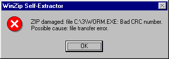 When a user clicks on 'Unzip' or 'Run WinZip' buttons the worm displays a fake error message and installs itself to system: