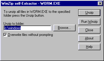 When a recepient gets this message and clicks on the attachment (which, he thinks is a ZIP archive) the worm infects his system as well. First the worm outputs a WinZip Self-Extractor -like dialog:
