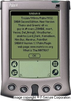 Upon execution the Palm/MTX_II.A displays a following dialog containing greetings to other virus writers.