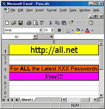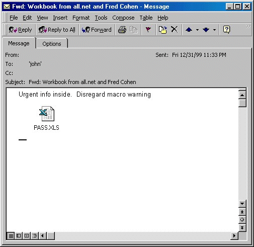 From: (name of infected user) To: (60 names from alias list of the infected user) Subject: Fwd: Workbook from all.net and Fred Cohen Urgent info inside. Disregard macro warning. Attachment: XPASS.XLS