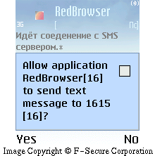 Redbrowser.A is J2ME based Java Midlet that sends SMS messages to specific number. The Redbrowser pretends to be a WAP browser that offers free WAP browsing using free SMS messages to send the WAP page contents, but what it actually does is to send SMS messages to one specific number, which may cause financial losses to the user.