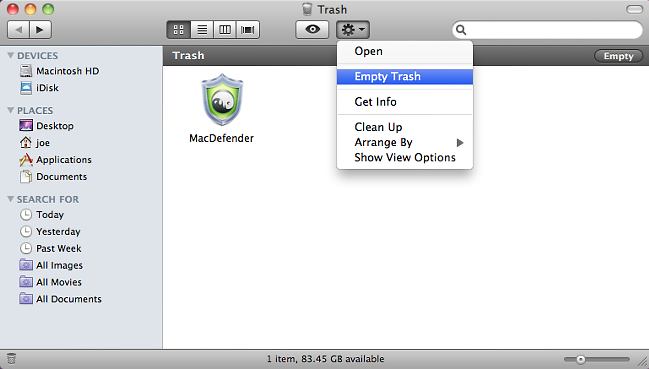 5. Open Applications, then drag the MacDefender application to the Trash:
