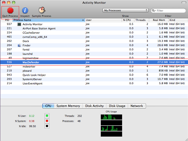 2. In the Activity Monitor, select the MacDefender application, then click the "Quit Process" button: