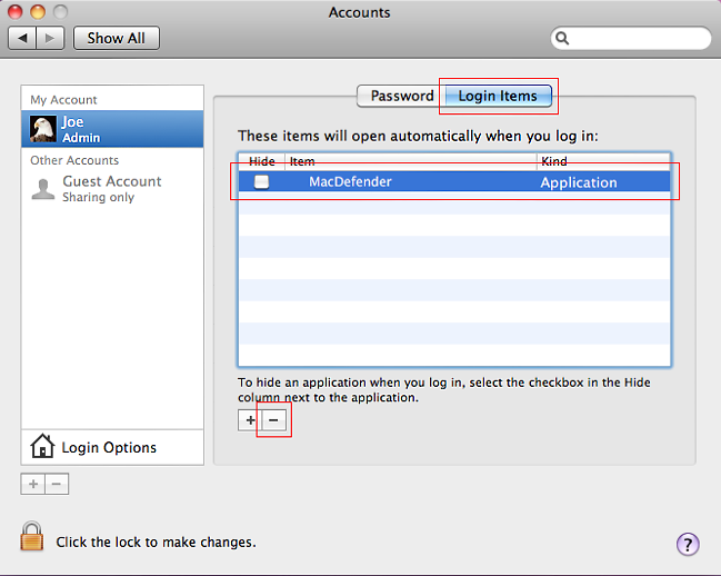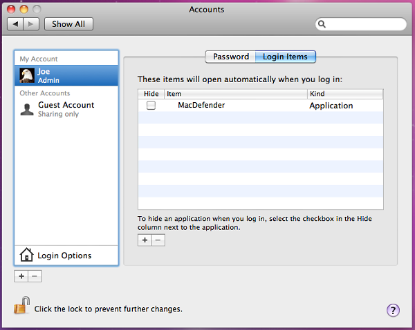 4. On the "Login Items" tab, select the MacDefender application, then click the minus (-) button: