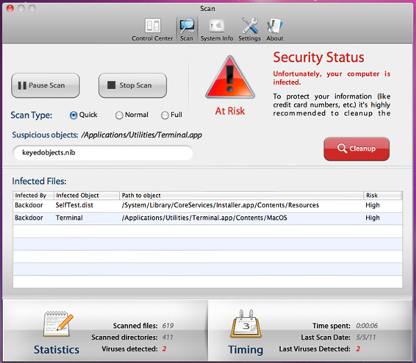 The rogueware poses as a legitimate virus scanner, reporting bogus infections and occassionally opening pornographic websites to trick users into believing an infection is present on the computer.