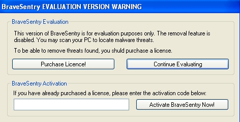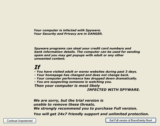 Rogue:W32/BraveSentry is a rogue antivirus program that reports fake scanning results to the user in order to dupe them into purchasing the "professional" version of the product.