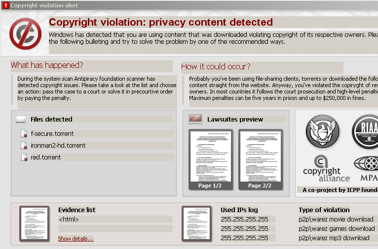 Rogue:W32/DotTorrent.A identifies a trojan which displays fake messages indicating an "Antipiracy foundation scanner" has discovered torrent files on the computer violating the copyright of the file's respective owners. This is an attempt to frighten the user into paying money to a (fictional) organization, ICPP, supposedly to pay for the copyright violation fine and for a 'legal license purchase'.