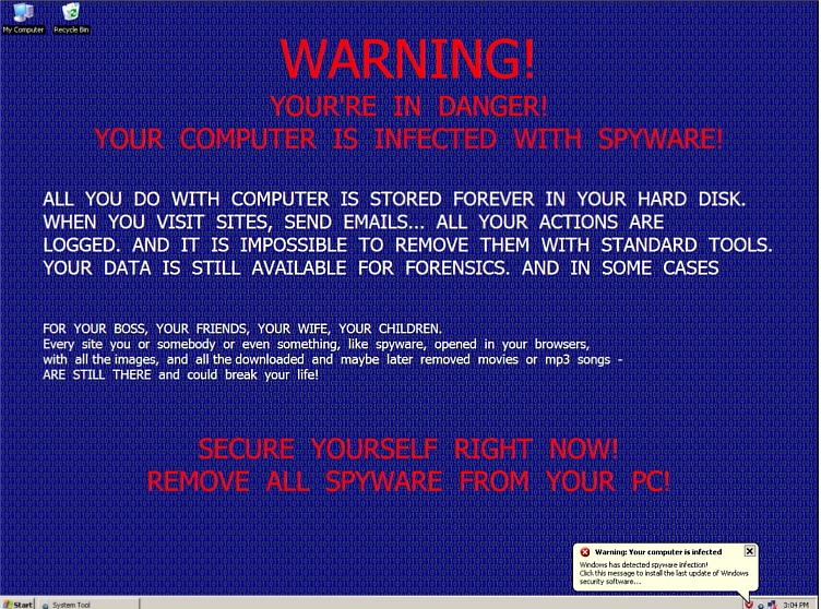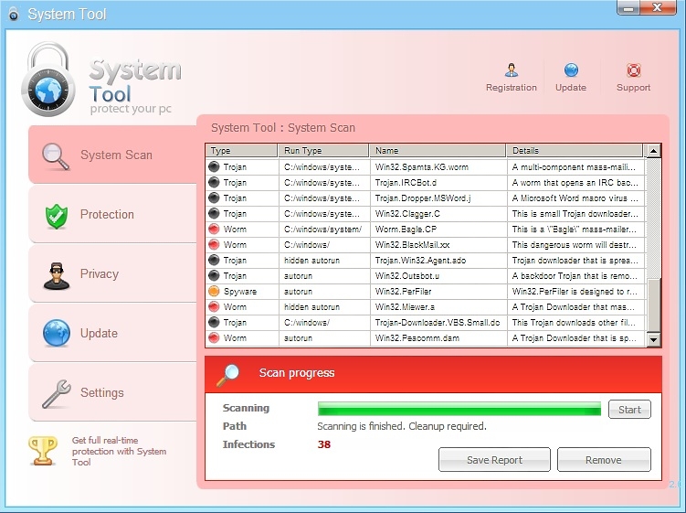 It then displays a fake scanner program (System Tool) that displays bogus virus/trojan/spyware detections.