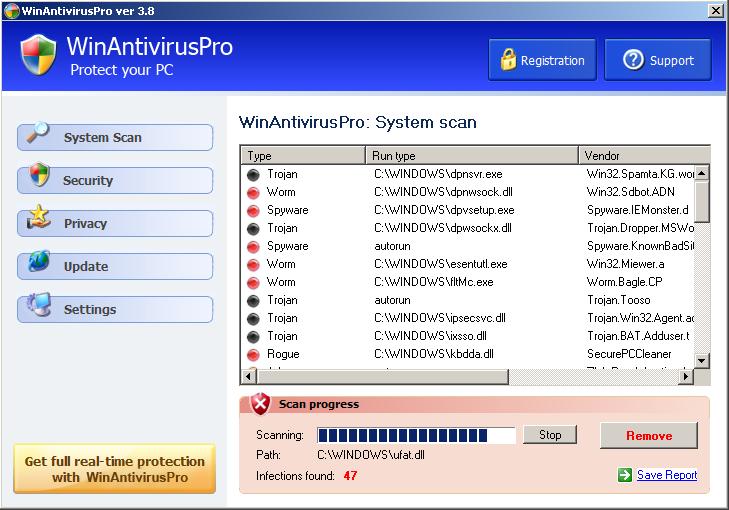 Winantivirus is an rogue antivirus program that pretends to scan the system, and then displays false or exaggerated results. Here is a sample screenshot of program while it performs a system scan: