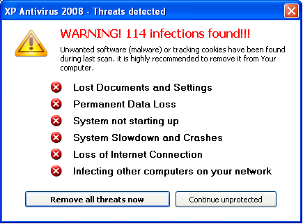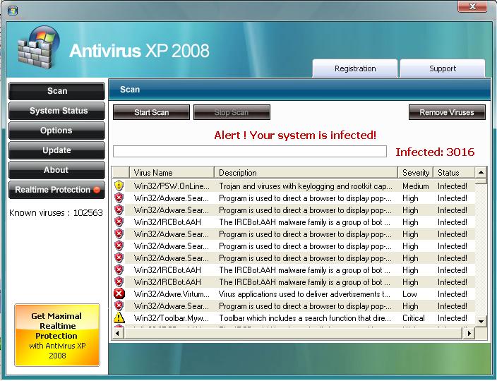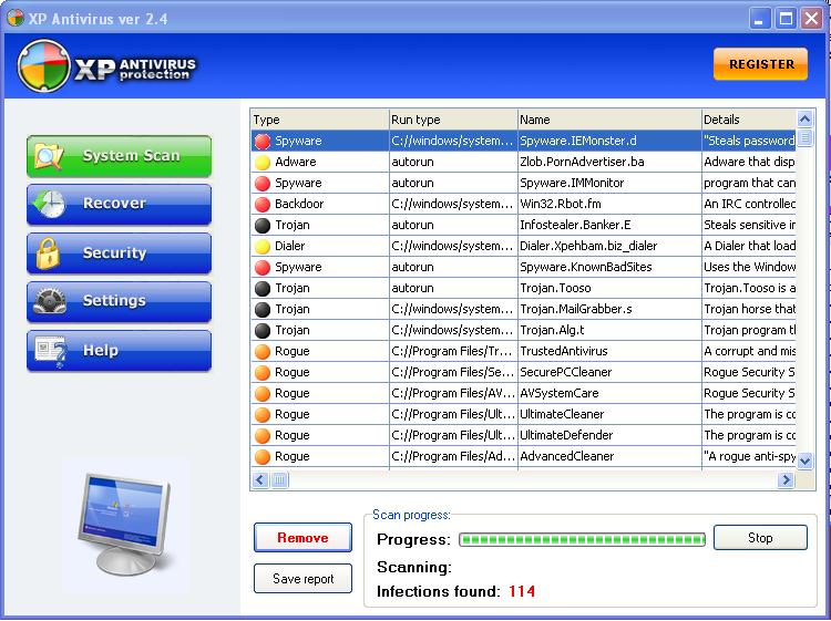 XPAntivirus is a family of rogue security programs that claim to detect and remove malicious software, but give fake and exaggerated scan results in an attempt to trick people into purchasing the program.Members of the XPAntivirus family are distributed under several different names, including: