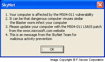 Two hours after infection Sasser.E displays the following message: