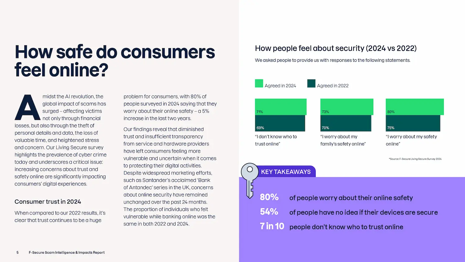 Uncover critical insights into emerging consumer scam trends for US service providers. Informed by F-Secure threat intelligence experts, the Scam Intelligence and Impacts Report examines the US scam land­scape, offering actionable strategies for service providers to build customer trust in an era of rampant online deception and fraud.