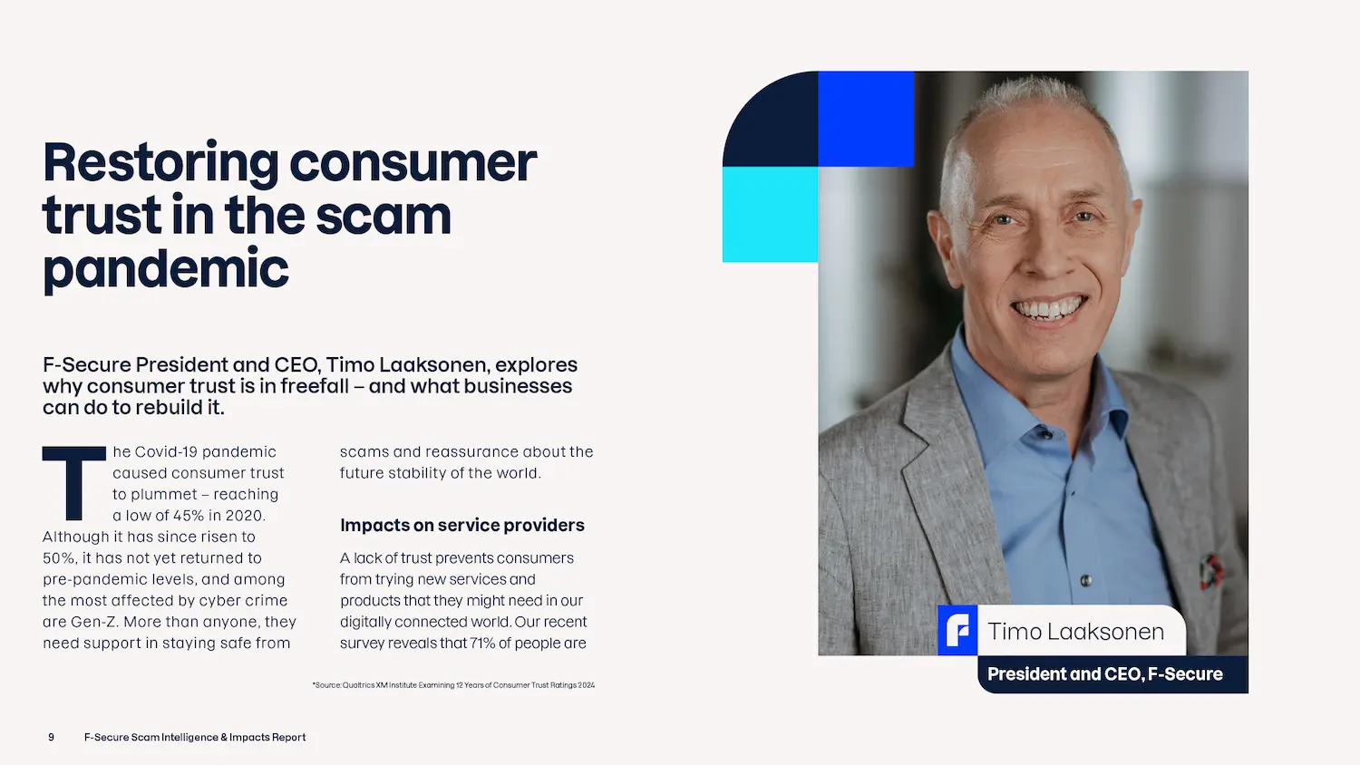 F-Secure President and CEO, Timo Laaksonen, explores why consumer trust is in free­fall, the impacts this loss of trust has on service providers, and what businesses can do to rebuild it. This chapter will guide you through: