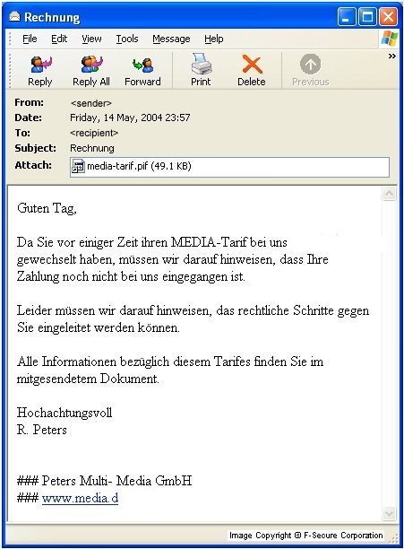 Man hort und sieht nikkes mehr von Dir! Haste D.e.i.n.e. Tage oder so?;) Ware mal sehr nett von dir, wenn Du mal was von dir horen laaaasssssen tutest(tut tut)! bis spaeeeter mal Diese Information ist Passwort geschutzt. Da Sie uns Ihre Personlichen Daten mitgeteilt haben, ist das Passwort Ihr Geburts-Datum! Viel Spass mit unserem Angebot Guten Tag! Das diese email automatisch generiert wurde, darf aus Datenschutzrechtlichen Grunden die vollstandige email nur angehangt werden. Ihre neuen Account Daten finden Sie im beigefugten Dokument. Vielen Dank fur Ihr Verstandnis. Wir bitten dies zu berucksichtigen. Guten Tag, Da Sie vor einiger Zeit ihren-Tarif bei uns gewechselt haben, mussen wir darauf hinweisen, dass Ihre Zahlung noch nicht bei uns eingegangen ist. Leider mussen wir darauf hinweisen, das rechtliche Schritte gegen Sie eingeleitet werden konnen. Alle Informationen bezuglich diesem Tarifes finden Sie im mitgesendetem Dokument. Hochachtungsvoll R. Peters ### Peters Multi- Media GmbH ### www. Hi... ich wollte dir schnell mal mitteilen, dass sich ein gefahrlicher Virus/Trojaner uber Internet Seiten verbreitet. Achte auf die Infos im Anhang!!! Ciao! Hey alles klar? Hier sind die Tools die du haben wolltest! Viel Spa? damit ;) Cu! Weitere Informationen befinden sich im Anhang dieser Mail Da Du mir dein Foto geschickt hast, hier nun ein Bild von mir! Ja, leider kann ich es nicht andern aber es ist so. Wenn Du genauso fuhlst, dann schau dir bitte den Anhang an. Wenn nicht, dann losche ungeoffnet diese Mail! Es ware mir sonst zu peinlich .....
