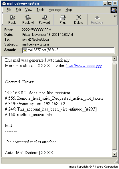 The worm sends email messages with English and German texts and its file attached. The attached file can be an executable or a ZIP archive containing the worm's executable. The worm composes several different types of messages and the content of these messages is variable. Here's an example of a English message sent by the worm: