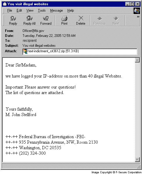 Dear Sir/Madam, we have logged your IP-address on more than 40 illegal Websites. Important: Please answer our questions! The list of questions are attached. Yours faithfully, M. John Stellford ++-++ Federal Bureau of Investigation -FBI- ++-++ 935 Pennsylvania Avenue, NW, Room 2130 ++-++ Washington, DC 20535 ++-++ (202) 324-3000