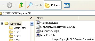 Also the worm creates a few files in Windows System folder. Due to a bug in the worm's code the names of these files can look like a garbage, for example: