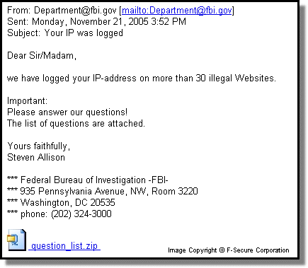 Dear Sir/Madam, we have logged your IP-address on more than 30 illegal Websites. Important:Please answer our questions! The list of questions are attached. Yours faithfully, Steven Allison *** Federal Bureau of Investigation -FBI- *** 935 Pennsylvania Avenue, NW, Room 3220 *** Washington, DC 20535 *** phone: (202) 324-3000