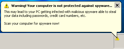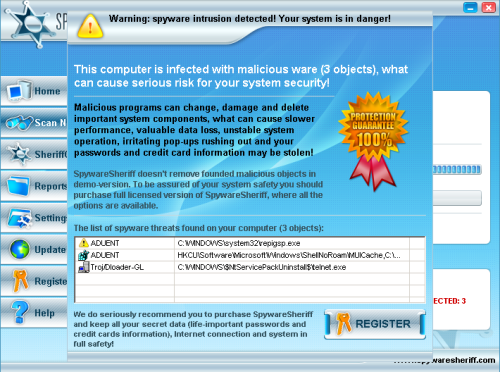 In some cases, Spywaresheriff is advertised by a trojan with a hoax message that the system is unsafe. The trojan malware does not install the antispyware application. If the user clicks on the warning message, they are directed to a website from which the user can download and install SpywareSheriff.