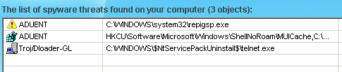 The message above was generated on a previously clean system image. Note that the third item listed is telnet.exe, a Microsoft application installed with the Windows Operating System. The first and second items listed in this example are the trojan malware referred to above.