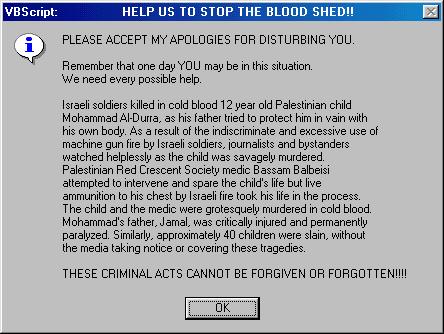 When executed, the worm copies itself to the Windows System directory as "injustice.TXT.vbs". Then it sends itself to 50 random recipients from each address book. The worm also sends several infected messages to email addresses in Israel.Next the worm shows a message related to Middle-East war, as follows: