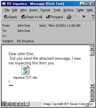 Subject: RE:Injustice Body: DearDid you send the attached message, I was not expecting this from you ! Attachment: injustice.TXT.vbs