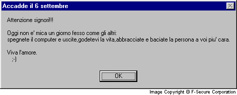 After this it displays seven message boxes with Italian messages and exits. The installed copy at next startup opens the Windows Address Book and mails itself to all the addresses it can find there. Due to a bug in the code the worm can't find the correct addresses in the WAB file so it is unable to spread.On the September 6th it displays the following message: