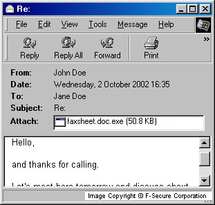 Sometimes the worm picks up email messages from infected user's database and sends them out with its copy attached. Also the worm can place contents of a random text file from an infected hard drive to an infected message's body. It can send itself in a message with one of the following subjects: