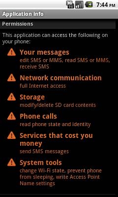 The trojan is only installed if the user clicks on the link in the malicious SMS. Shown below are the permissions requested by the trojan:
